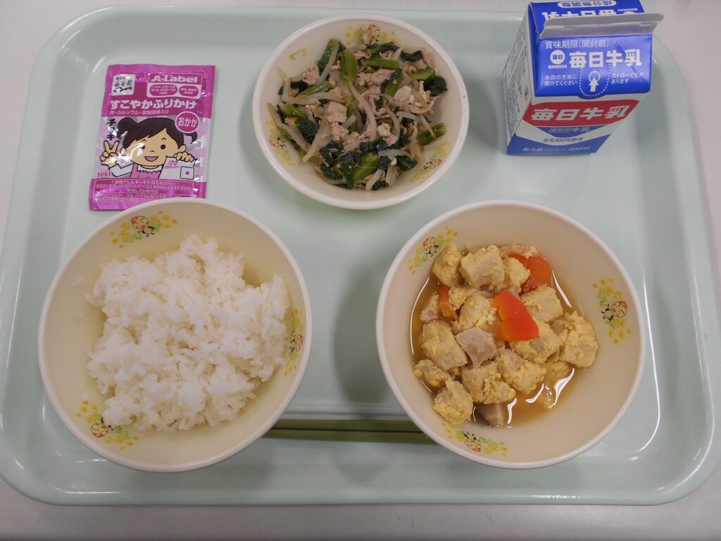 【献立】ごはん、牛乳、小松菜の炒め物、高野豆腐の卵とじ、かつおふりかけ