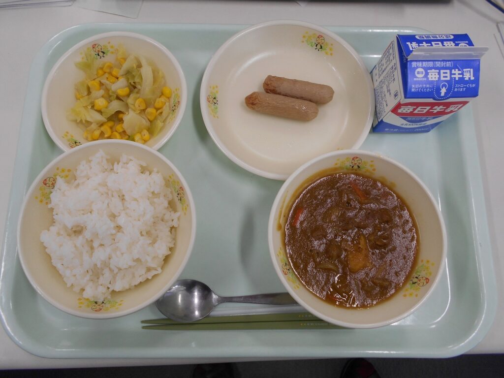 【献立】ごはん、牛乳、焼きウインナー、キャベツソテー、近江牛カレー
