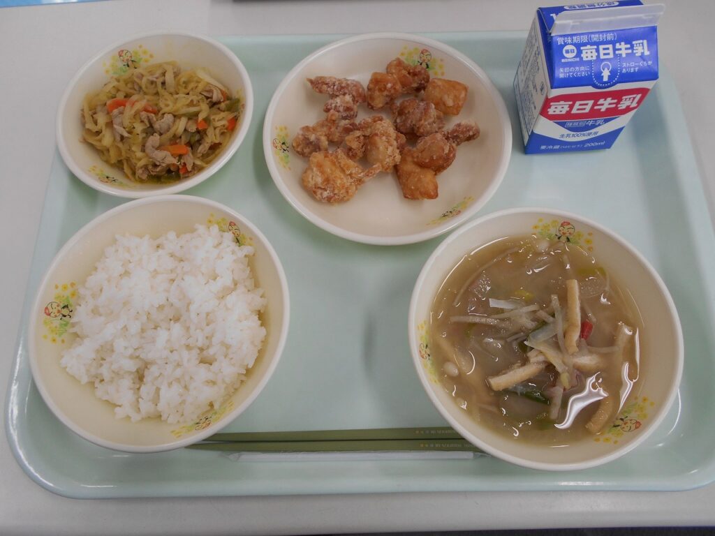 【献立】ごはん、牛乳、鶏肉のから揚げ、切り干し大根のカレー炒め、具だくさんんみそ汁