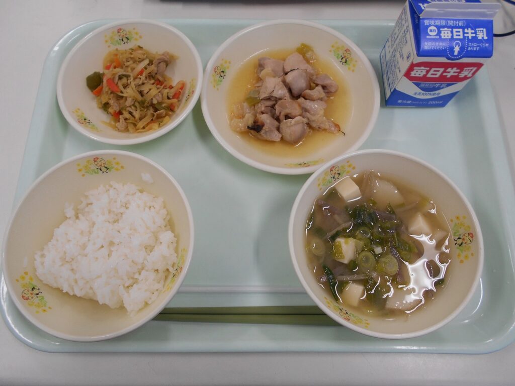 【献立】ごはん、牛乳、焼きとり、切干し大根のカレー炒め、みそけんちん汁