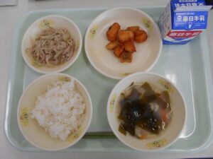 (きょ)(う)の「(や)(さい)かき(あ)げ」は、給食室(きゅうしょくしつ)で1つずつ手作(てづく)りをしている(こころ)のこもった料理(りょうり)です。さつまいもとごぼう、たまねぎを(ほそ)(き)り、みつばを(い)れて小麦粉(こむぎこ)片栗(かたくり)(こ)(あ)わせ、1つずつ(あぶら)(あ)げています。野菜(やさい)たっぷりなので食物(しょくもつ)せんいが(おお)くとれ、おなかの掃除(そうじ)をしてくれます。