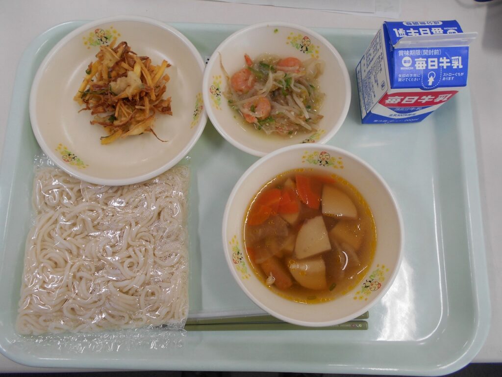 【献立】ソフト麺、牛乳、えびの塩こうじ炒め、野菜かき揚げ、五目うどん汁