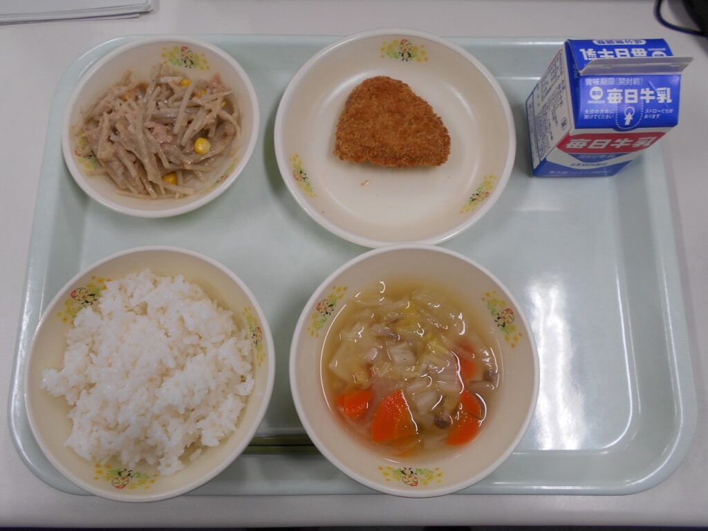 【献立】ごはん、牛乳、かぼちゃひき肉フライ、ごぼうとツナのごまサラダ、白菜スープ