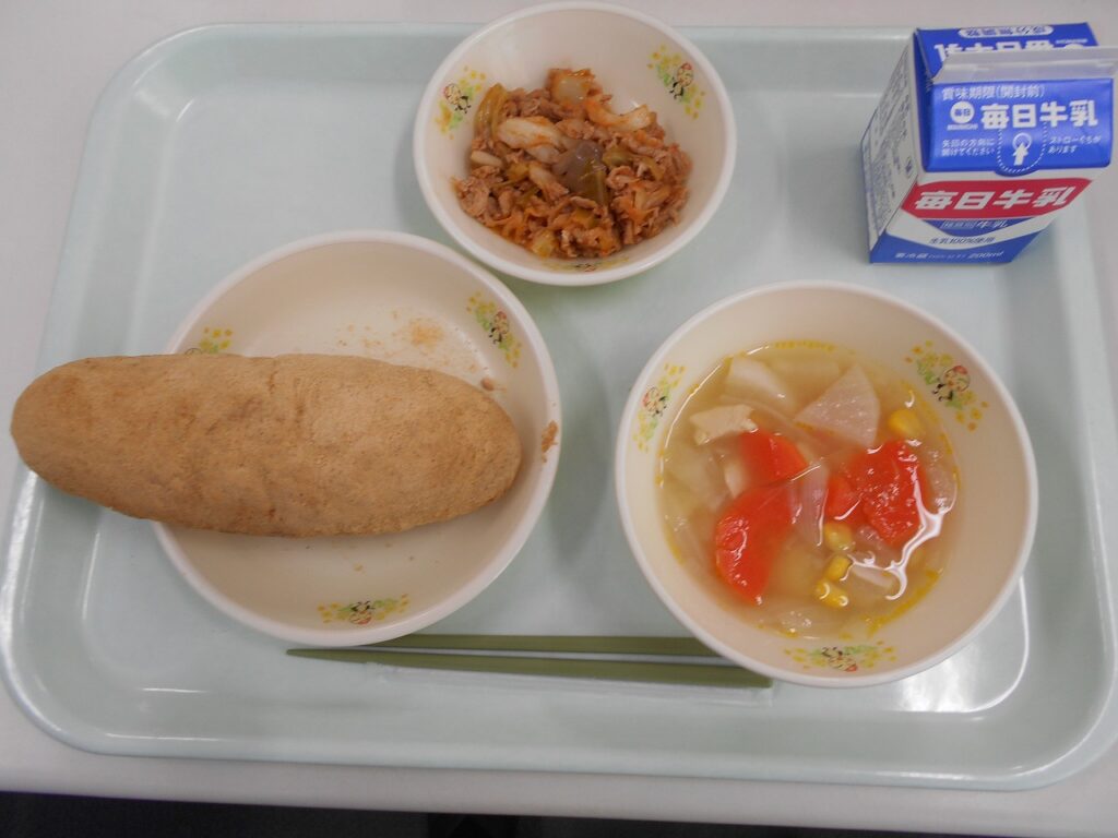 【献立】きなこ揚げパン、牛乳、豚肉のケチャップ炒め、コンソメスープ
