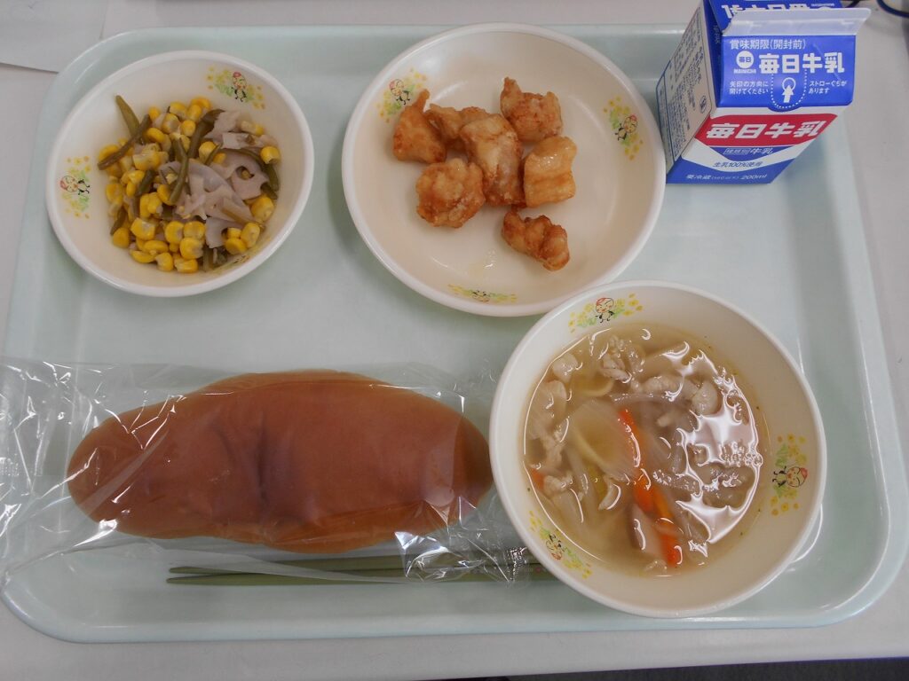 【献立】黒糖コッペパン、牛乳、鶏肉のレモンソース、くきわかめのガーリックソテー、マカロニスープ