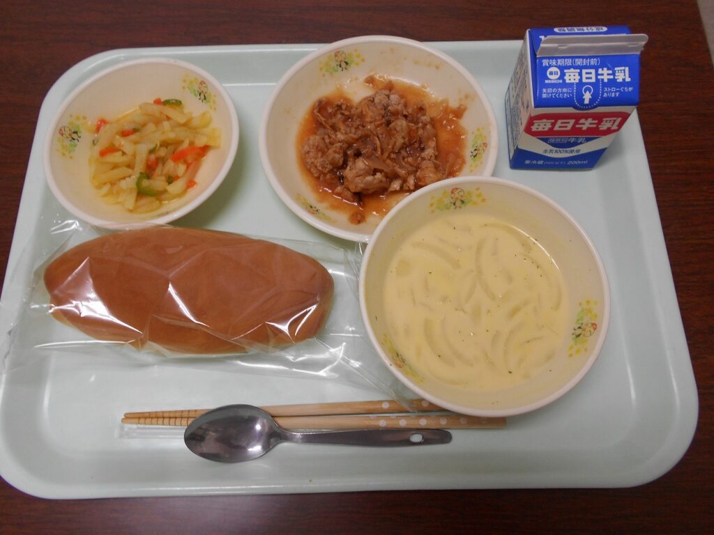 【献立】コッペパン、牛乳、豚肉のバーベキューソース、じゃがいものソテー、コーンクリームスープ