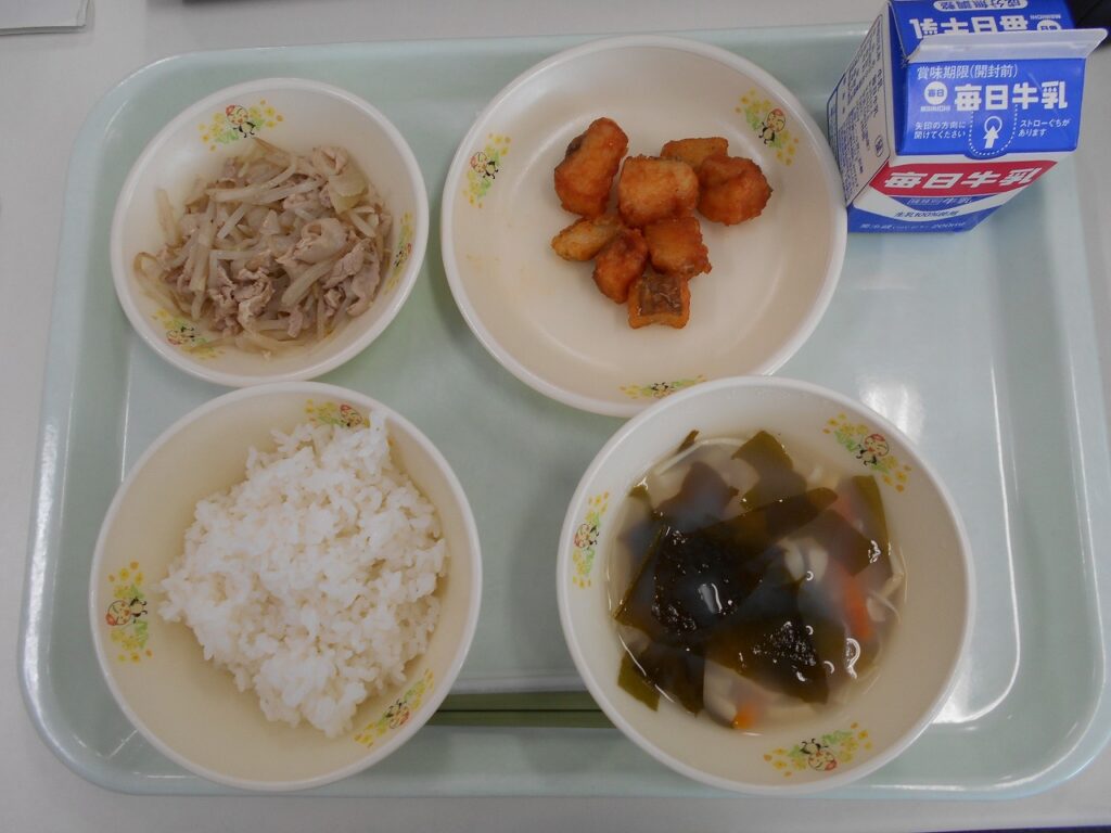 【献立】ごはん、牛乳、白身魚のチリソース、豚肉ともやしの炒め物、トックスープ