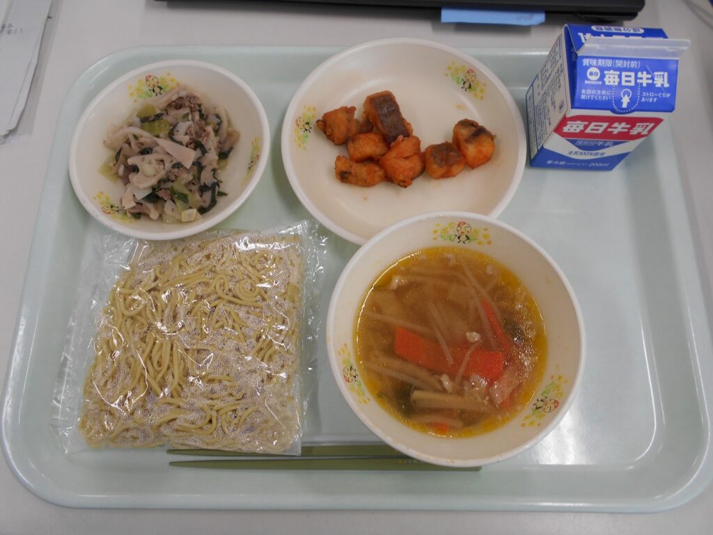 【献立】中華麺、牛乳、白身魚のチリソース、チンゲンサイとれんこんの炒め物、しょうゆラーメン汁
