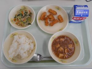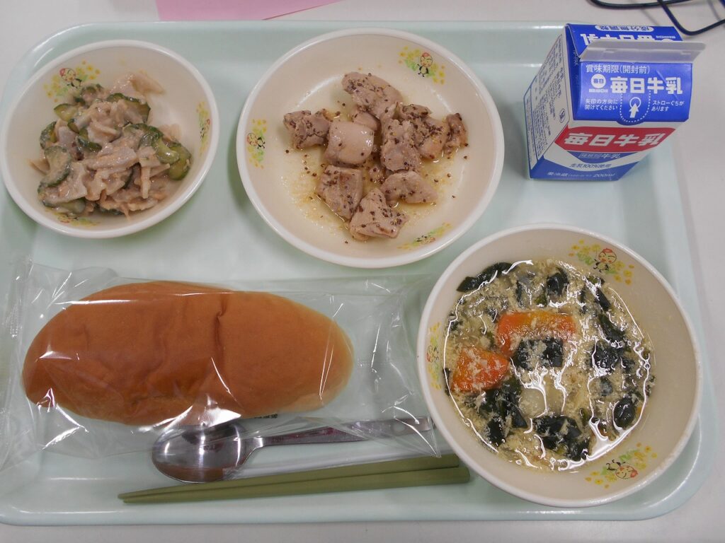 【献立】コッペパン、牛乳、鶏肉のハニーマスタード焼き、れんこんツナサラダ、たまごスープ