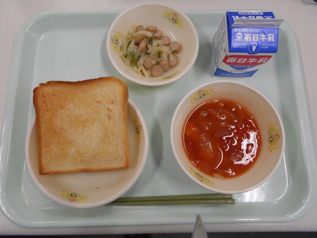 給食のパンは、朝、パン屋さんから届きます。今日は、そのパンに給食室でひと手間加えています。食パンに、バターと砂糖を混ぜたものを塗ってオーブンで焼いた、シュガートーストです。カリッとした食感を楽しみながらいただきましょう。おかずは、じゃがいもやウインナーを炒めたポテトソテーと、鶏肉、玉ねぎ、とうもろこしなどが入った具だくさんのトマトスープです。