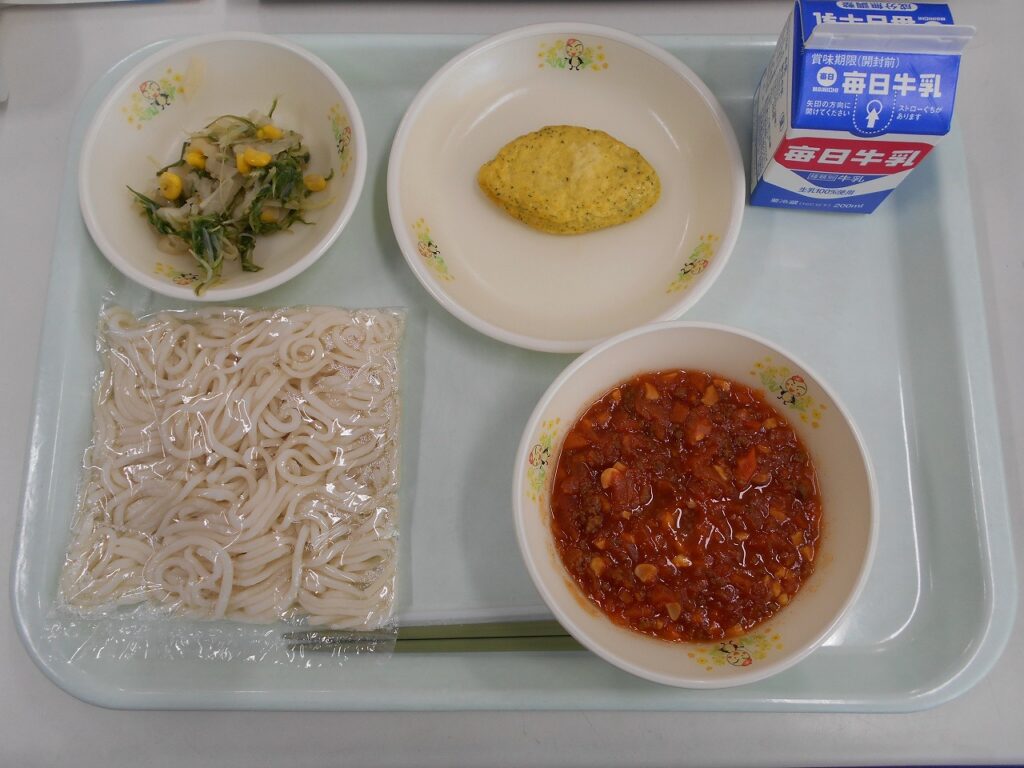 【献立】ソフト麺、牛乳、ほうれん草オムレツ、大根と水菜のサラダ、ミートソース
