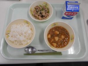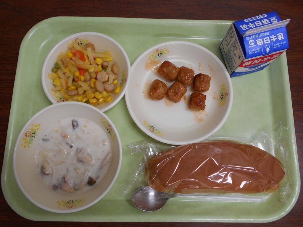 【献立】コッペパン、牛乳、ミートボール、ピティパンナ(ウインナーとじゃがいものソテー)、フィッシュスープ