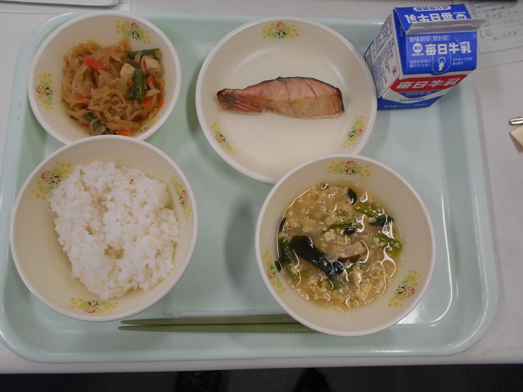 【献立】ごはん、牛乳、鮭の塩焼き、切り干し大根の煮物、かきたま汁