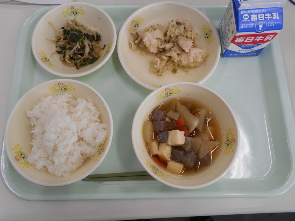 今日は、滋賀県の隣の岐阜県の料理を味わいましょう。「鶏ちゃん」は、鶏肉と野菜に特製のたれを絡めて炒めた料理です。ジンギスカンをまねて作られたという由来があり、作り方には地域や家庭によって違いがあります。給食では、みそ味のたれを絡めて、オーブンで焼きました。「大歳のごっつぉ」は、大みそかに大きな鍋でたくさん作り、三が日の間に何度も煮返して食べられる年末年始に欠かせない料理です。