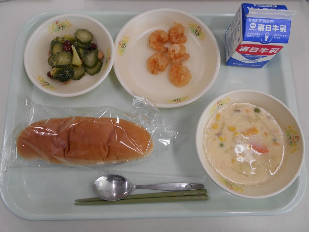【献立】コッペパン、牛乳、ガーリックシュリンプ、ビーンズサラダ、コーンクリームチャウダー