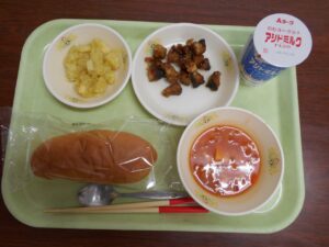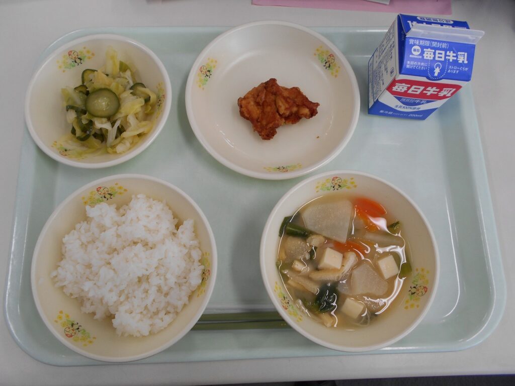 【献立】ごはん、牛乳、とり天、キャベツときゅうりの酢の物、守山矢島かぶらのみそ汁