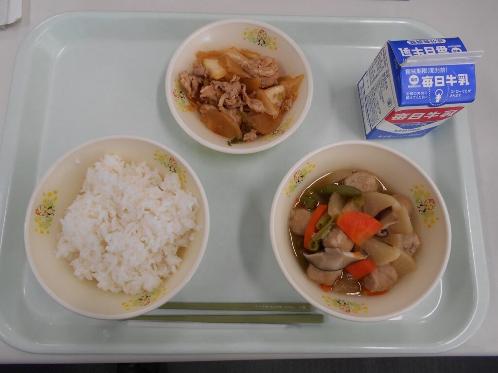 【献立】ごはん、牛乳、キムタクご飯の具、つくねと大根の煮物