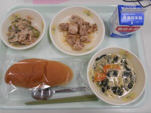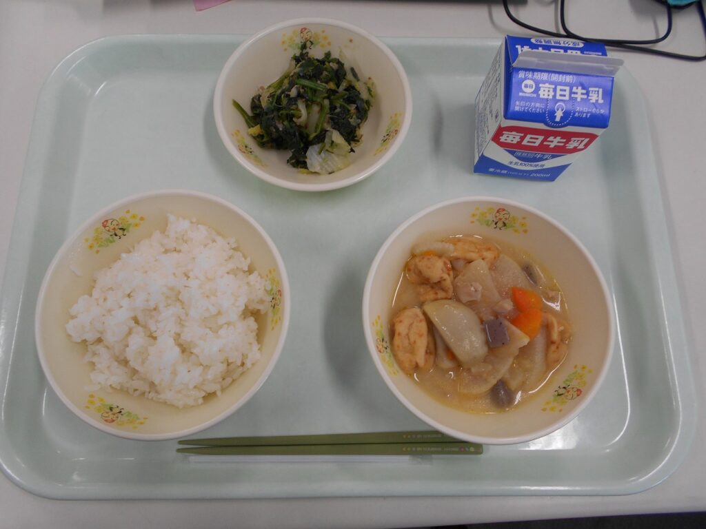 今日は、感謝給食の日です。いつも当たり前のように食べている毎日の給食ですが、たくさんの人のおかげでできています。野菜やお米を育てる人、食べ物を運ぶ人、給食室で作ってくれる人など多くの人にお世話になっています。「いただきます」は、食べ物と作ってくれた人への感謝の気持ちがこめられています。心をこめて食事のあいさつをして食べましょう。