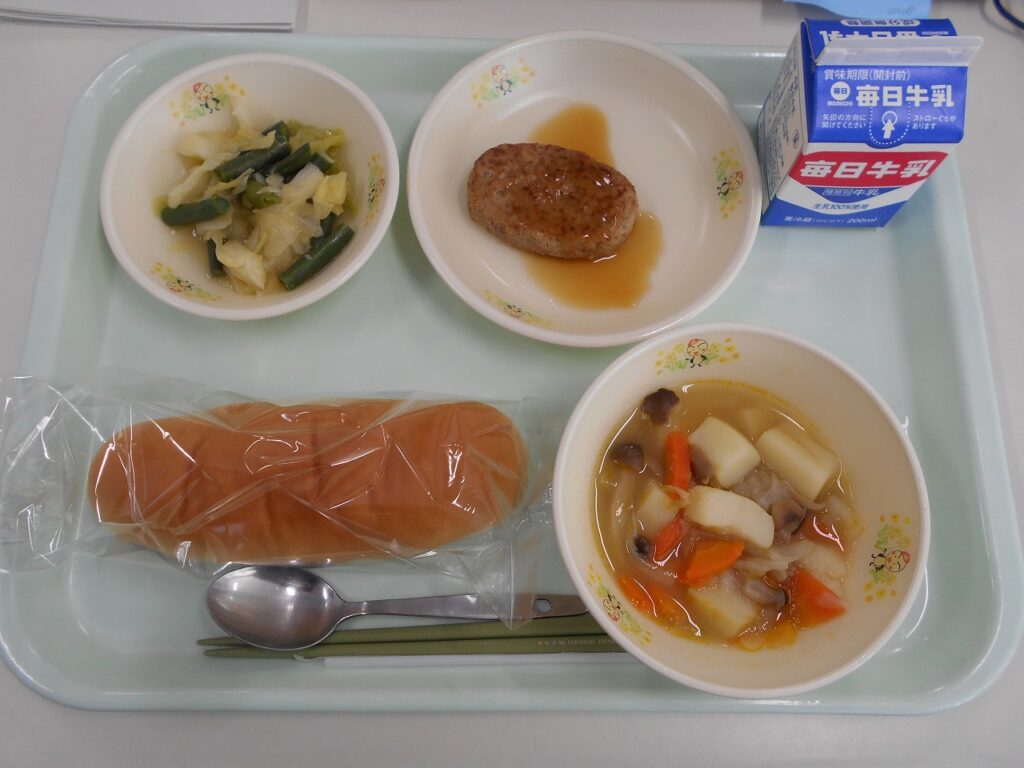 【献立】コッペパン、牛乳、照り焼きハンバーグ、キャベツといんげんのソテー、ポトフ