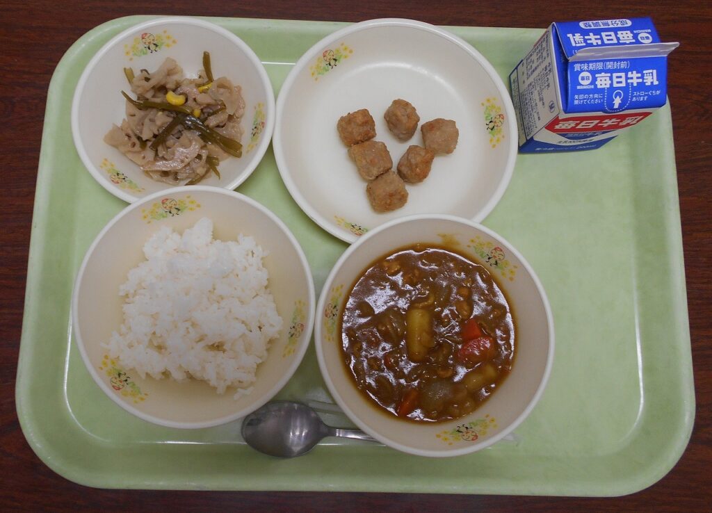 【献立】ごはん、牛乳、焼きチキンボール、根菜のガーリックソテー、ポークカレー