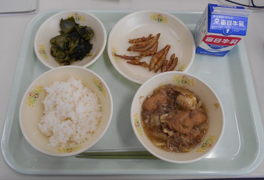 【献立】ごはん、牛乳、わかさぎの更紗揚げ、わかめときゅうりの酢の、近江牛のじゅんじゅん
