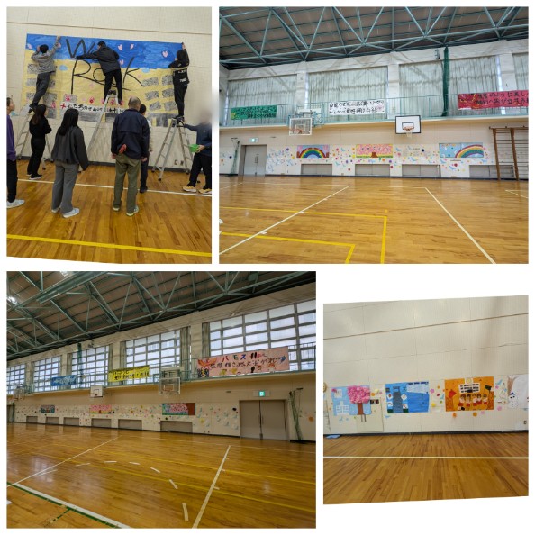 体育館の装飾も仕上がり、会場は華やかな雰囲気に包まれています。特に、5年生が力を合わせて制作した巨大壁画は圧巻で、先生が丁寧に設置し、ついにすべての準備が整いました。