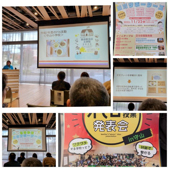 守山市PTA連絡協議会が主催する、「もりやま教育サポーターズ交流会」が守山市役所で開かれました。今回のイベントは、従来行われていた「守山市PTA大会」に変わるもので、これまでの講演会中心の内容から、学校を中心とする子どもの教育にかかわる様々な団体をつなぐ内容となりました。初めに、守山小学校と河西小学校のPTA活動の発表があり、その後各団体の方々からのPR, そして、それぞれのブースへ行って話をするといった形は、まさに横のつながりを作る上で絶好の機会となりました。