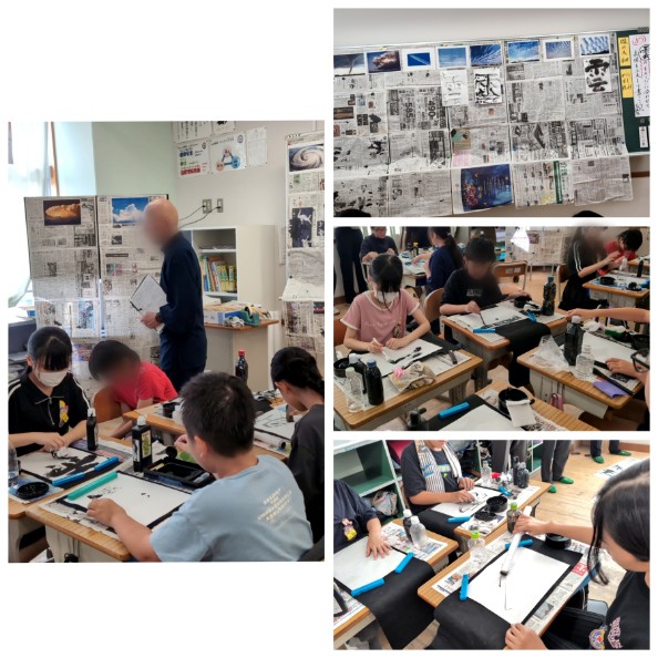 6年生の書写では、「雲のイメージに追わせて表現を工夫して書く」学習を行いました。事前に「雲」のイメージを十分に膨らませ、字の形や墨の濃淡をを考えながら字を書いていきます。また、書く道具も筆ではなく、画用紙や新聞紙、ラップの芯、スプーンやフォークなど、自分のイメージに合うものを選び考え書いていきます。子どもたちは、自分が書いた字を見返し、工夫点を見つけながら、独創的な字を書いたいました。