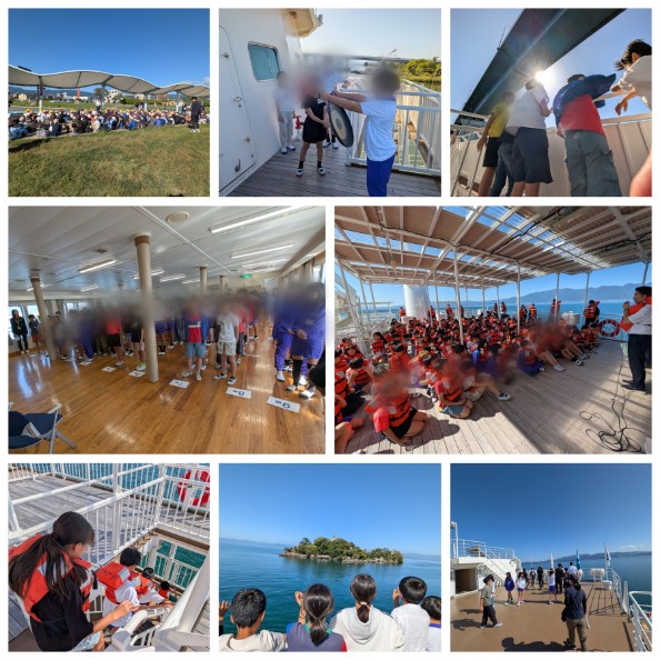 続いて、開校式です。みんなで大きな声でうみのこ周航歌「希望の船」を歌うことができました。そして、避難訓練です。避難訓練はフローティングスクールの中でも最も重要な学習です。緊急時、自分の命を守るためのものなので、笑顔がいらない学習となります。学校の避難訓練と大きく違うところはライフジャケットを着用するというところです。4分30秒という短い時間で171名全員が甲板まで避難することができました。