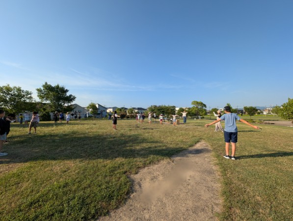 ラジオ体操巡り⑤~今宿~ 2025年7月29日 最終更新日時 : 2025年8月18日 fugaadmin 5日目は、焔魔堂公園です。ここは、守山市内でもカラに広い公園で、その丘の上でラジオ体操をしていました。小高い丘の上から下の風景を見下ろしながらのラジオ体操は、とても気持ちよかったです。総勢30名を超える大規模なラジオ体操でした。