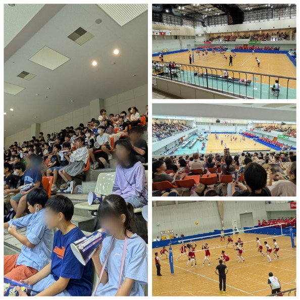 現在、滋賀県では国民スポーツ大会が県内各地を開催されております。守山市では、ソフトボール、サッカー、バレーボールの競技が行われております。本日は、4年生が守山市民体育館で少年女子(高校生)の3位決定戦を観戦しました。初めてバレーボールを生で見る子どもたちがほとんどで、はじめは館内の盛り上がりに戸惑いながらも、大きな声で両チームを応援する姿が見られました。「フレーフレー宮城」「がんばれがんばれ大分」子どもたちの必死の声援のせいか、試合はフルセットまで続き、大興奮のまま会場を後にしました。次、国スポが滋賀県で開かれるのは何十年もあとのことだと思いますので、子どもたちにとってはとても良い経験となったことと思います。バレーボールをやってみようと話している子どもも見られ、スポーツの普及にも繋がりました。