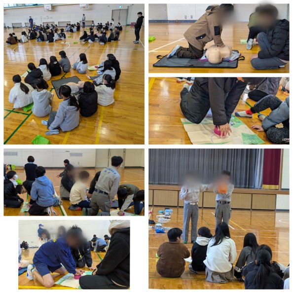 湖南消防北消防署の方々に来ていただき、高学年対象の「心肺蘇生講習会」が行われました。子どもであっても、心臓マッサージの仕方やAEDの使い方は知っておくべきことだと思います。消防署員の方からは、とにかく呼吸がなかったら心臓マッサージをし続けることを学びました。絶え間なくし続けなければならないので、子どもたちは結構体力が必要であることを実感していました。