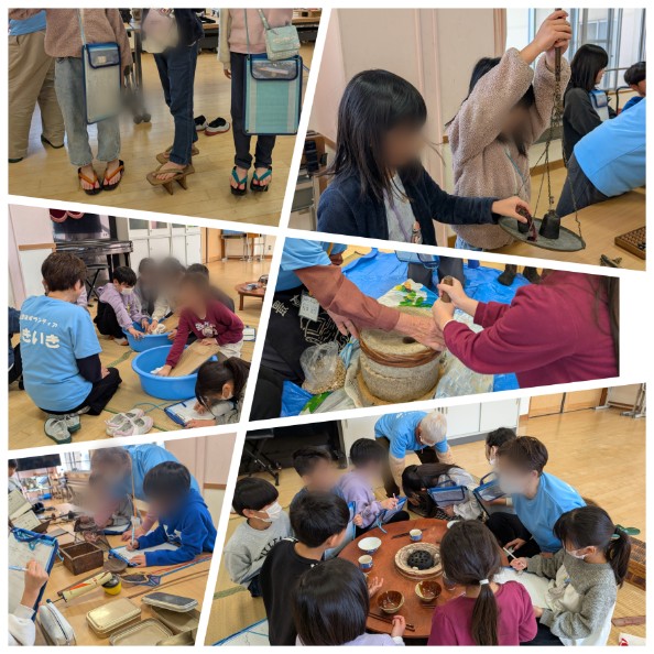 煎った大豆を石うすで挽き、きな粉を作る体験や、洗濯板で洗濯をする体験、下駄をはいたり天秤で重さをはかったりなど、体験を通して、昔のくらしについて理解を深めました。