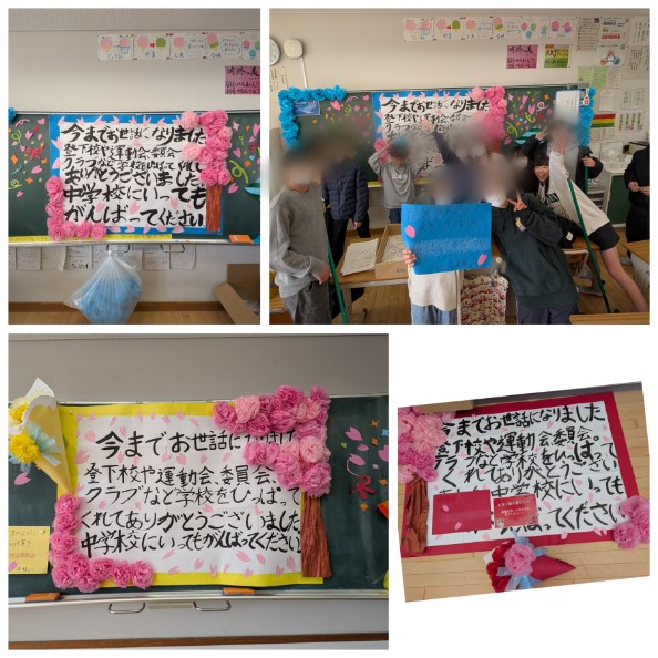 突然の光景に、6年生は驚きと喜びの表情を浮かべ、教室は温かい空気に包まれました。 この黒板アートは、5年生が送る会の最中にこっそり準備してくれたものです。6年生への感謝と憧れの気持ちが込められた、素敵な贈り物となりました。